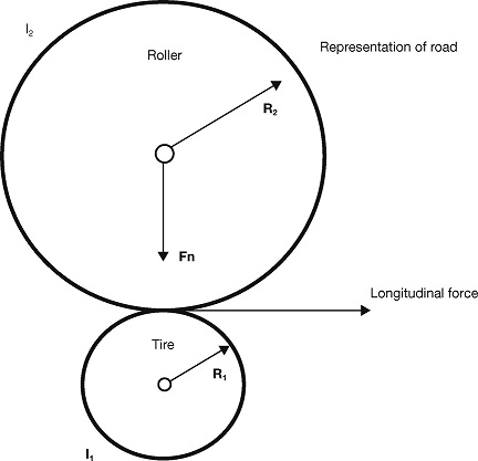 The test bed designed to obtain data for the analysis on the tire-road contact forces consists on a roller and a tire. The roller represents the road as well as the weight of the vehicle, as seen in Figure 4, where I 2 is the inertia of the roller, I 1is the inertia of the tire, R 2 is the ratio of the roller, R 1 is the ratio of the tire and F n is the normal force. The roller axis of rotation is free to move in the vertical direction to guarantee that the tire is subjected to the full roller weight. The main reasons for using this design is its simplicity and the analogy with the dynamic model of the quarter vehicle.