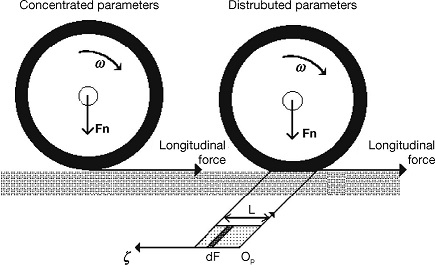 2. Concentrated or lumped parameters, where an average or uniform behavior for all the elements in the contact patch is assumed. The total force is represented by a scalar quantity that is equivalent to the integration of differential forces in the contact patch for the distributed form. Figure 6 illustrates these two representations.