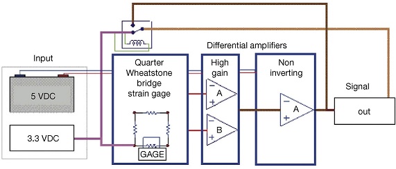 The circuit that was used to condition the strain gages consists on a Wheatstone Bridge, with the strain gage laid in one of the arms. In the amplification stages, two high-gain differential amplifiers for each gage and a non-inverting amplifier to amplify the output voltage were used. Amplifier gains were chosen to make the output voltage to be in the range from 0 to 5 [V] (see Figure 9).