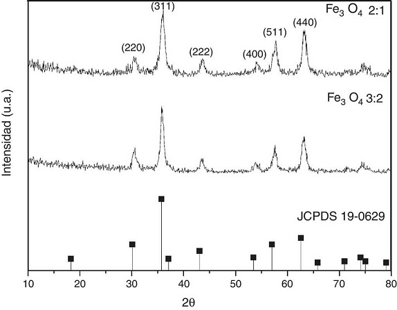 Figure 1 shows the XRD patterns of MNPs obtained at two different molar ratios. The crystalline phase identified was magnetite. The main reflections at 30.1, 35.4, 42.9, 57.5 and 62.7 (2θ degrees), for (220), (311), (400), (511) and (440) Miller indexes, respectively (JCPDS card No. 19-0629).