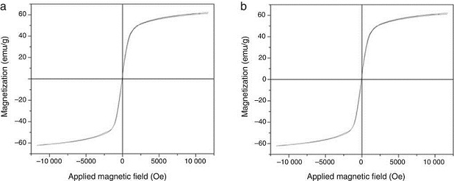 The magnetic hysteresis loops of the obtained MNPs are presented in Figure 2. As observed, the magnetic behavior was similar in both cases: low coercivity and high magnetic permeability.