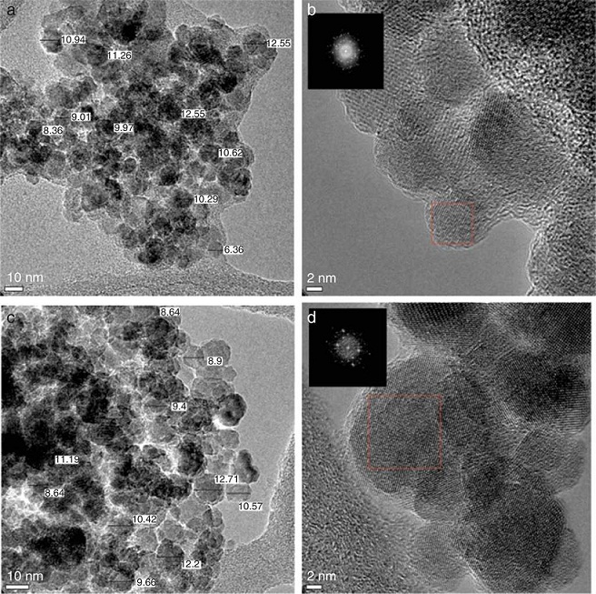 The size and morphology of the synthesized MNPs were performed by the TEM images shown in Figure 3. The results indicated that the nanoparticles are approximately spherical and the mean size is ranged between 8 and 12 nm (Fig. 3a and c), which is consistent with the results obtained by XRD. These sizes are within the allowed range for magnetic hyperthermia applications (Veiseh, Gunn, & Zhang, 2010). Figure 3b and d shows the HRTEM micrograph, the corresponding electron-diffraction pattern indicates that the magnetite has a spinel-type structure. Furthermore, the interplanar distances observed d = 0.148, 0.253, and 0.2967 nm correspond to the crystallographic planes (440), (311) and (220) respectively, which is in line with standard JCPDS card No. 19-0629.