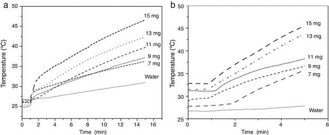 An important factor that must be considered is the heating ability of the MNPs when a magnetic field is applied; this according to the fact that magnetic hyperthermia consists of raising the temperature in the body through magnetic nanoparticles. When a magnetic nanoparticles system is subjected to an oscillating magnetic field, the absorbed energy is then converted into heat by several physical mechanisms (Neel relaxations and Brown rotation), and the transformation efficiency strongly depends on the frequency of the external field as well as the nature of the particles such as particle size and surface modification (Ma et al., 2004). The heating capacity of the magnetite nanoparticles was evaluated under an applied magnetic field of 10.2 kA m−1 and frequencies of 200 kHz (Fig. 4a) and 362 kHz (Fig. 4b). Heating curves of the magnetite obtained at molar ratio 2:1 are shown in Figure 4, testing 7, 9, 11, 13 and 15 mg of magnetite nanoparticles in 2 ml of distilled water.