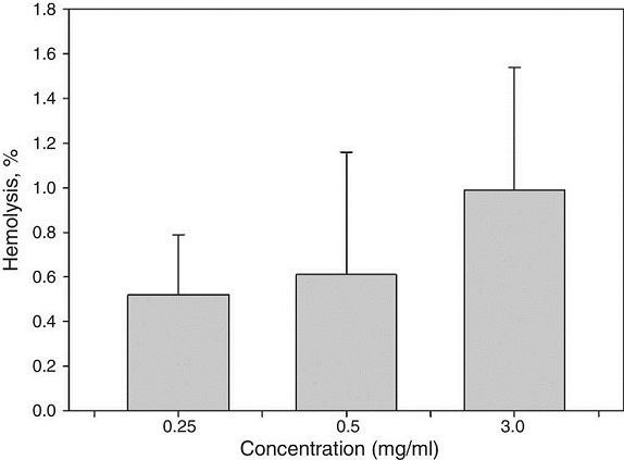 When the external membrane of the erythrocytes is destroyed, hemoglobin is released. It is possible to estimate the amount of destroyed erythrocytes in a given test by measuring the quantity of hemoglobin in a sample. This works as a reference to know the toxicity grade of a dispositive that will be in contact with human blood. The hemolytic activity of the nanoparticles was determined according to a previously reported method (Múzquiz-Ramos, Guerrero-Chávez, Macías-Martínez, López-Badillo, & García-Cerda, 2014).