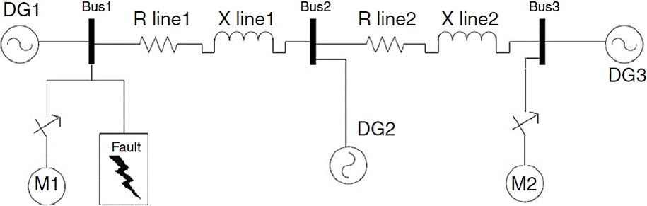 In order to study dynamic loads in a microgrid with droop control, induction motor as the most common industrial load is chosen to be examined. Motor characteristics like stator and rotor current and rotor speed are observed in fault conditions. Single phase schematic of the circuit is shown in Figure 10 where M1 and M2 are induction motors. Motor parameters are also given in Table 2 where rs and Ls are stator resistance and inductance. r'r and L’r are rotor resistance and inductance. Lm is the magnetizing inductance.