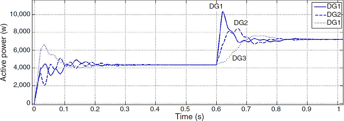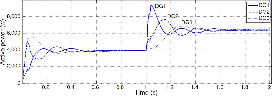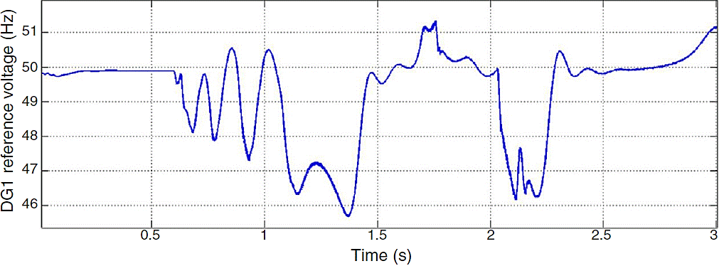 The main cause for instability is due to the extreme demand of current and power. According to the droop characteristic, DGs frequency will fail to converge because they generate large amount of active power and their generation difference is remarkable. Reference frequency determined by power controllers for one of three DGs is shown in Figure 13.