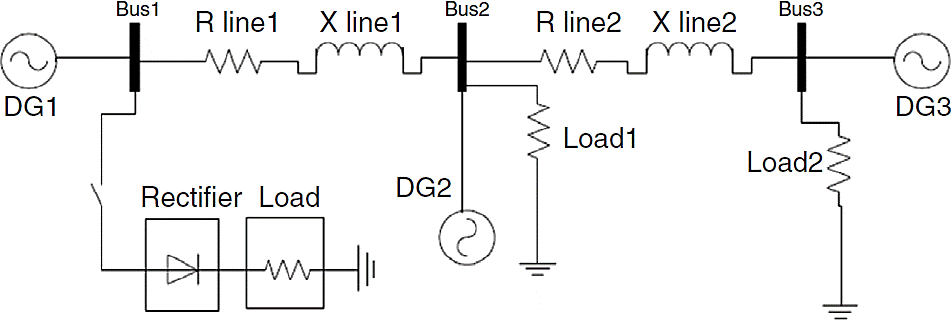 In this part imbalanced harmonic distorted load is studied in the microgrid with droop control. Considering Figure 15, after starting the simulation a two-phase rectifier is connected to bus 1. This load is nonlinear and imbalanced.