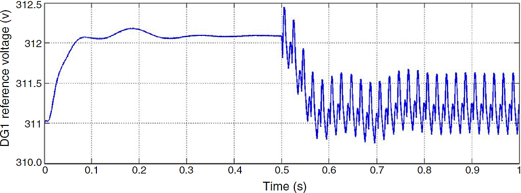 Figure 16 shows reference voltage of d-axis created by DG1 inner controllers in dq0 frame. After switching the rectifier, oscillation is visible in this figure. Large deviations in reference voltage absolutely for the DG of bus 1 where the nonlinear load is located are noticeable. This contributes to low voltage regulation because output voltage fails to track the reference voltage due to its fast deviations.