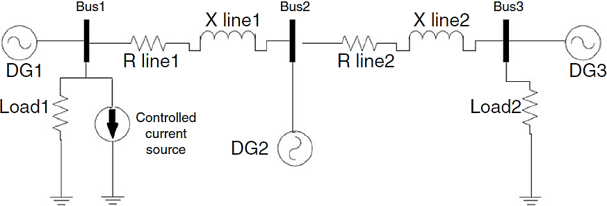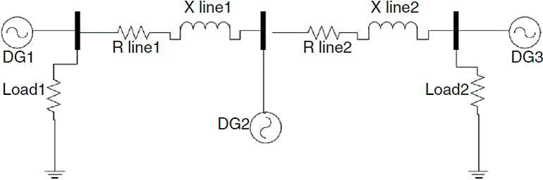 Figure 4 shows the microgrid single phase schematic. It contains three buses with a DG in each bus. Network and controller parameters like resistance and reactance of lines, inverter output filter, switching frequency and droop gains are given in Table 1. fs is the inverter switching frequency. Coefficients of inner PI controllers are tuned in each section by trial and error method.