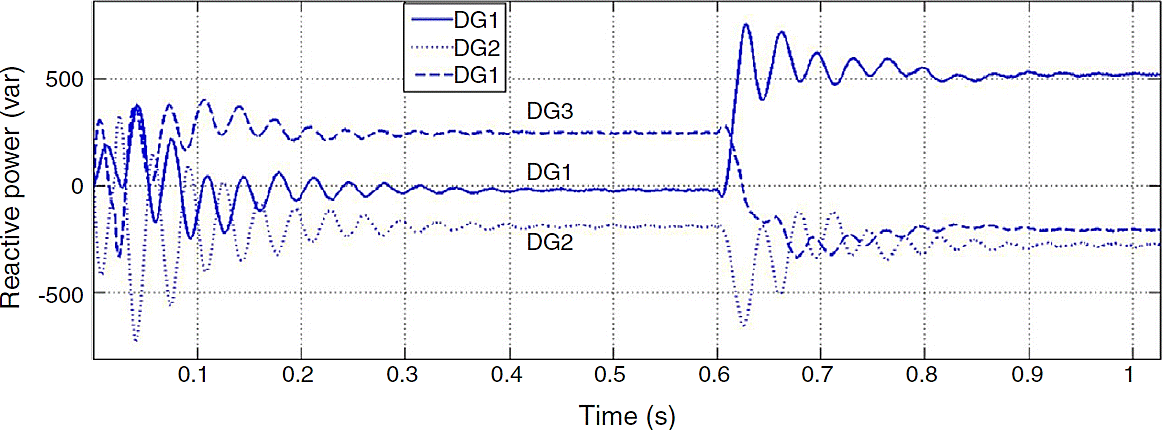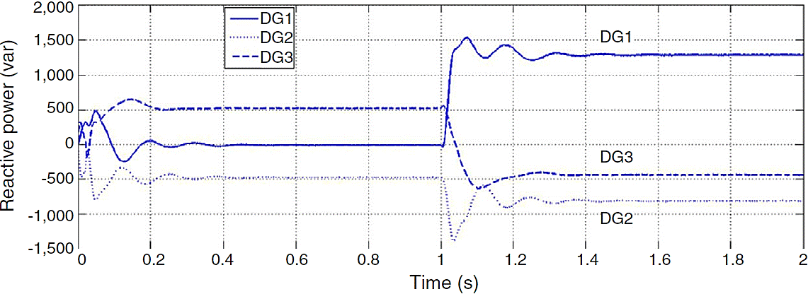Although the change in active power is made in bus 1, reactive power produced by each DG has noticeable change. In microgrids with resistive lines P and Q are mainly coupled to each other. In order to mitigate the coupling of DGs generated active and reactive power, droop gain should be tuned as well as maintaining system stability. Increasing the reactive power droop gain is considered as a solution to improve the power sharing performance. In Figures 8 and 9, active and reactive powers generated by DGs are shown for new reactive power droop gain (K2 = 0.6) which is chosen by trial and error method.