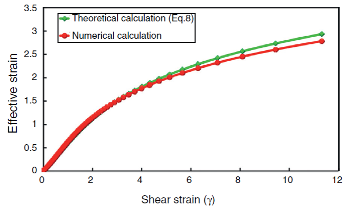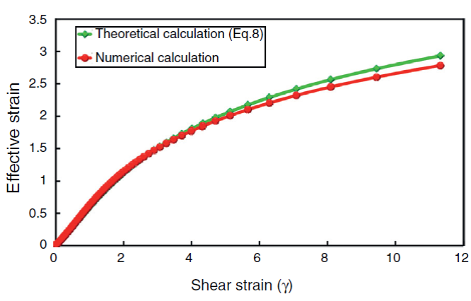 Generally, there are two main expressions for evaluating the equivalent strain at large simple shear deformation. Shrivastava, Jonas, and Canova (1982) suggested the following common equation for evaluating nominal equivalent strain at large simple shear deformation.
