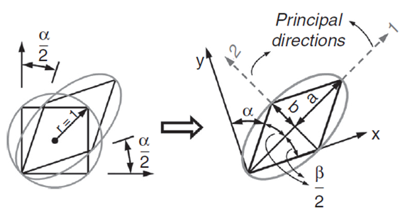 To evaluate equivalent strain in this mode, we can consider a square inscribed in a circle of unit radius. Deforming such geometry through pure shear changes this circle to an ellipse with major and minor diameters of 2a and 2b, respectively which are the principal strain directions (Fig. 3).