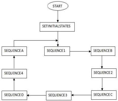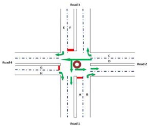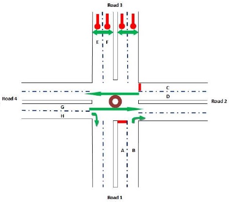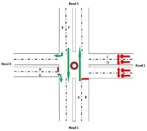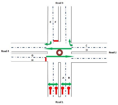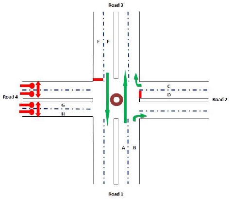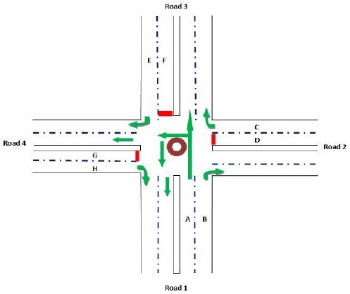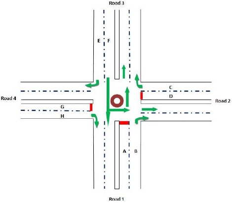 The arrow-headed lines in the phase designs indicate the allowed movement for vehicle traffic in a particular phase while the double arrow lines show the permitted movement of pedestrians. The desired cycle of operation is as shown in Fig. 3 in which the sequences with numbers (1, 2, 3, 4) represent sequence of preferential treatment (right of way) given to the four roads while sequences with letters (B, C, D, A) represent the right of way given to pedestrians. This means that for instance, after road 1 users have been given the right of way, the next sequence is that of the pedestrian crossing for road 1 (sequence B). Pedestrian crossing for road 2 ‘sequence C’ is enabled after right of way for the road 2 users ‘sequence 2’. Another cycle of operation begins after pedestrian crossing for road 4 i.e. ‘sequence A’.