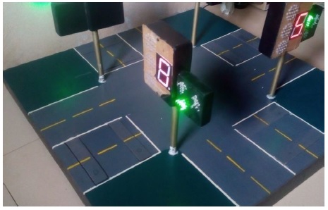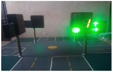 The outputs of the microcontrollers gave the correct signals as programmed and the LEDs arrangements gave optimal brightness and can be seen clearly by approaching vehicles. The density aspect of the system was tested and observed to be working perfectly when the two push buttons for road 1 were simultaneously depressed. Fig. 6 shows that road 1 users were automatically given the right of way with the green light. As well the arrow up and arrow right lights are ON.