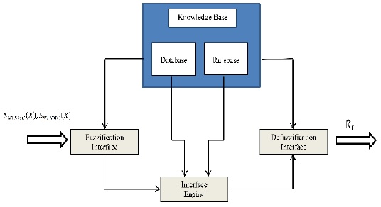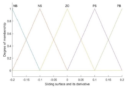 The fuzzy logic system is suggested to reduce the chattering problem. In this novel method, the switching gain is scheduled according to fuzzy rules. The structure of the fuzzy logic system is depicted in Fig. 3. In this method, the sliding surface and its differential are selected as the inputs and the switching gain is selected as the output. As shown in Fig. 4 and Fig. 5, the triangle membership function with 50% of overlapping is suggested. The fuzzy variables are defined as NB (Negative Big), NS (Negative Small), Z (Zero), PS (Positive Small), PB (Positive Big). Next, the rules of the fuzzy system are developed with the sliding surface and its derivative as a premise and switching gain as a consequent. A typical fuzzy rule is defined as follows