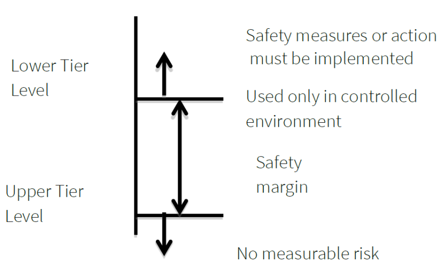 Fig. 1 shows the different levels indicating the safety measure. Below 100kHz the safety factor is not required for upper tier level as electro stimulation has no adhere effects but requires safety measures in lower tier level. 100kHz being thermal crossover frequency above which the thermal effect dominance is based on the average time of exposure. If the duration is less than the average timing then energy density, specific absorption rate (SAR) values shows their time dependence. The safety factor is 10 to 17 dB for upper tier and additional 7 dB for lower tier, if the exposure time is greater than the average time.