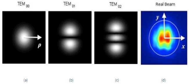 Figure 1 Intensity distribution of a Gaussian beam (a) and lower order modes (b, c). Intensity distribution of a real mixed mode and/or optically distorted beam (d).