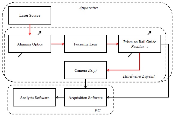 Figure 5 Scheme of the hardware layout. The camera records the beam intensity. The movement of the prism permits the collection of images along the beam path.