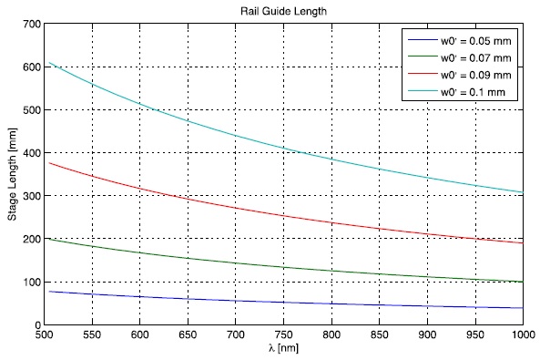 As shown in Figure 4, to design the apparatus, the focal length f and rail guide length L are selected based on these latter parameters and simulations of the Gaussian beam model, described below.