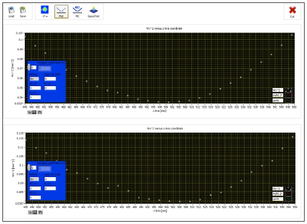 The image analysis module (Figure 14) processes the images extracting the beam radii and reconstructing the propagation functions W x (z) and W y (z) estimated from multiple images at each position (between 5 and 10). The two methods in Table 2 are available to estimate the beam parameters and to calculate M 2. Multiple images reduce the background noise and increase accuracy but take about 200 ms per image.
