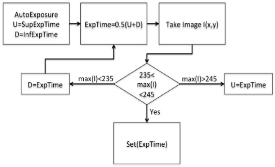 Figure 16 Autoexposure procedure. This procedure automatically sets the exposure time to avoid image saturation, (max pij < 255). procedure. Multiple images are stored at each position.