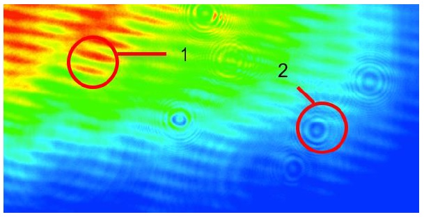 Figure 17 Detail of a real laser intensity image. Diagonal waves (1) caused by the diffraction of the neutral density (ND) filter. Round interference fringes (2) caused by dust grains on the CMOS sensor.
