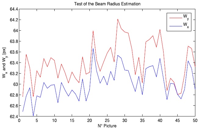Figure 18 Measured beam radii on the two main axes from 50 images (cut=5). The mean and the standard deviation result [pixels]: Wx-=63.01 σWx=0.27 Wy-=63.40 σWy=0.36
