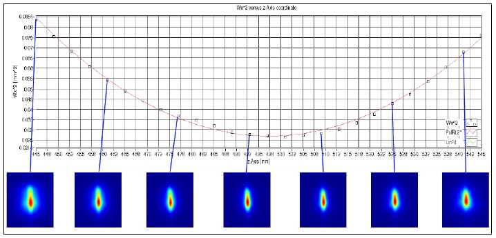 Figure 19 Laser beam sections along the beam path. The red line represents the squared radius variation. The images evidence that W0,x< W0,y.
