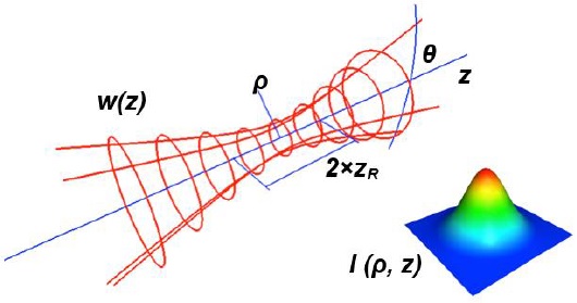 The propagation and the transverse axes z and ρ are represented in Figure 2. The intensity function I(ρ,z) (Figure 2, detail) is the time-averaged power density with Gaussian shape: