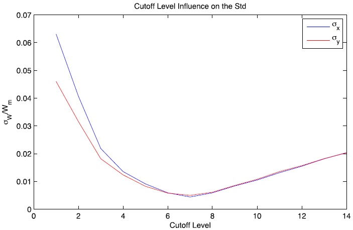 Figure 21 Effect of the cutoff level on the relative standard deviation. The beam radius is estimated over 50 pictures of the same section to evaluate the effect of the cutoff level on the mean and the standard deviation.