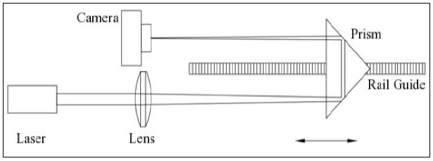 Figure 5 shows a prism mounted on a rail guide. The linear displacement of the prism varies the laser section being acquired by the camera. The beam reflection by the prism permits to use a shorter rail guide, saving space on the platform, as opposed to facing the camera directly towards the laser source. Moreover, it reduces the apparatus size also in the transverse direction as opposed to a couple of mirrors. It also allows keeping the camera fixed, avoiding the movement of this cabled device.