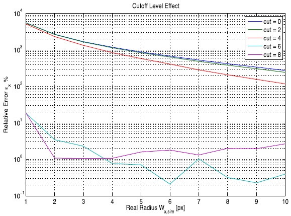 From Figure 7, it can be observed that the minimum error εx is achieved for cut = 6, for a radius greater than 5 pixels.