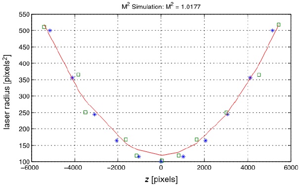Figure 8 shows the results for a simulated beam with M 2 = 1, obtained with the second method in Table 2. After fitting the data from 11 simulations, the error on M 2 is about 1%, which is considered acceptable.