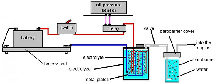 The surface area of the electrodes is crucial in the quantitative gas output. Under the influence of electric current, the water molecule begins to decompose into two hydrogen atoms and one oxygen. Such a gas mixture produces almost 4 times more energy during combustion than during combustion of molecular hydrogen (Kleemann et al., 2004). Therefore, the use of this gas in internal combustion engines leads to more efficient combustion of the fuel mixture, reduces the number of harmful emissions into the atmosphere, increases power and reduces the amount of spent fuel.