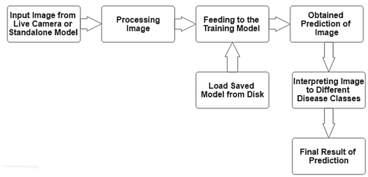 So here in system flow for prediction as in Figure 2, we're using model. Load to load the model that to be saved in local disk. The trained model's result was obtained using prediction after the model had been loaded. In the prediction the different classes are defined as 0: 'Bacterial spot’, 1:'Early_blight’, 2:'healthy’, 3:'Late_blight’, 4:'Leaf_Mold’, 5:'Septoria_leaf_spot’, 6:'Spider_mites’, 7:'Target_Spot’, 8:'mosaic_virus’, 9:'Yellow_Leaf_Curl_Virus’, 10:'background'. The numeric values from 0 to 10 are represented in classification summery along with the precision, recall and f1 score of the respective class.