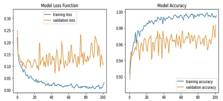 The proposed concept is conducted using a Jupiter notebook and Python on a Windows 10 computer with 16GB of RAM, a 1TB hard drive, and an Intel(R) Core (TM) i5 CPU of the 7th generation Dell OptiPlex 7050. The plant village dataset is used to analyse leaf photos of leaves with nine different illnesses, including Bacterial Blight and Leaf Spot, as well as healthy leaves and background images.The approach of leaf disease detection training flow is shown in Figure 1 below. We have considered a total of 11 image classes in this process. The images considered are taken from the open-source platform PlantVillage (Huang & Chang, 2020) One leaf and one background are all there is in each image. The image size was then changed from 256 * 256 to 224 * 224. Following that step, the database is partitioned into a training dataset and a validation set. In data analysis, techniques called "data augmentation" are used to increase the quantity of figures by adding marginally altered versions of previously available dataset or brand-new synthetic data that is created from existing data. When a machine learning model is being trained, it serves as a regularizer and aids in lowering overfitting. supervised machine learning includes classification models as a subset. An output from a classification model categorises the input after it has read some input. In this case, the Xception model was used for classification. Deep learning neural network models were trained using a training dataset of images. The model's performance changes with each iteration because this training is iterative, which means that small tweaks to the model weights are made over time. In this case, a total of 100 epochs were utilised during the training process. An algorithm for machine learning is optimised using a loss function. The model's performance in these two sets determines how the loss is calculated, which is based on training and validation data. In training or validation sets, it is the total number of errors made for each example. A model's loss value indicates how well or poorly it performs after each optimization iteration.