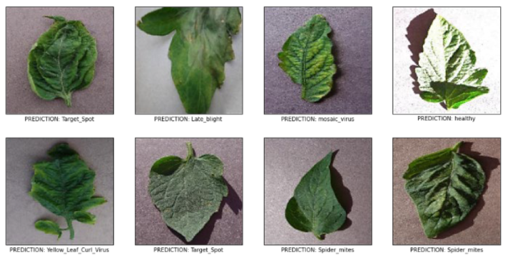 We trained our model on plant leaf images using deep learning method to classify disease. This goal was achieved with 98.00% accuracy in the PlantVillage data set 11 classes. The model accurately classifies disease without feature engineering. Model loss and accuracy plots represented in the Figure 5. The Figure 6 presents the random images from prediction the prediction was done on the validation set.