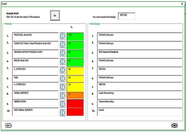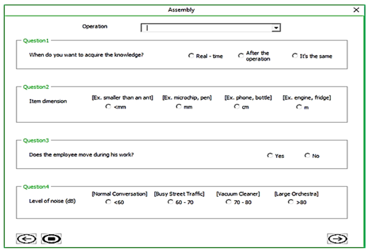 On these user forms, the user answered several questions concerning parameters that are impacting the operations. By selecting the task, you get the list of the knowledge acquisition methods that are related to the selected operation. The ranking/arrangement is done according to the analysis made in Section 4. This ranking will change based on a specific evaluation metric (Table 24) that is being induced by answering questions requested in the questionnaire. Each response penalizes one or more ranking methods through a coefficient generated from the metric.