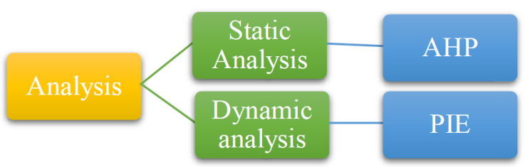 The first phase is called static analysis, and it uses AHP (analytical hierarchy process) techniques. Both the knowledge acquisition (KA) methods and the operations of the process being studied will be analyzed individually and jointly.