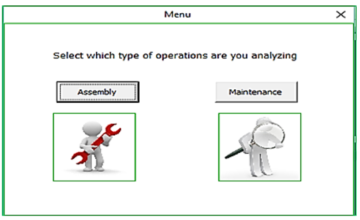 This interface introduces and provides a detailed directory of the tool. By clicking the "Go" button, you switch to the second user form (Figure 7) that enables users to choose which process to analyze, e.g., assembly, maintenance etc.