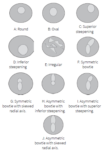 Bogan et al. (1990) suggests a classificatory scheme of the patterns observed in anterior corneal topography maps for normal subjects. Bogan’s classification is, in turn, expanded by Rabinowitz et al. (1996) who introduces five additional cases. They open the existing classification to include asymmetric corneal topographic patterns as shown in Figure 1. D, H, G and J are the patterns, which are at risk.