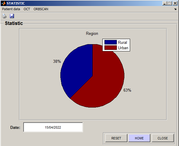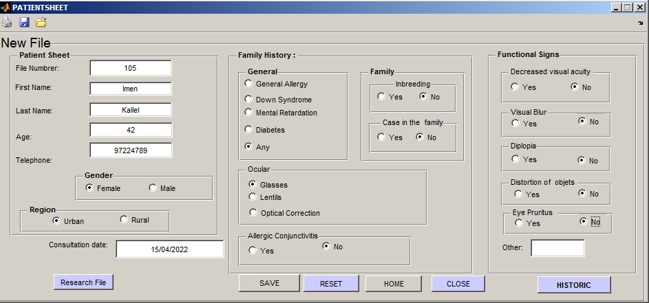 Furthermore, the window contains four buttons, as shown in Figure 2. The first buttons identified as "RESET". The second is for the return to the home page. The "SAVE" button is used to save data in a table designed in excel. Next, the "CLOSE" button, as its name suggest, closes the sheet patient window. Finally, the toolbar offers the possibilities of printing, opening the intended, and saving the considered options.