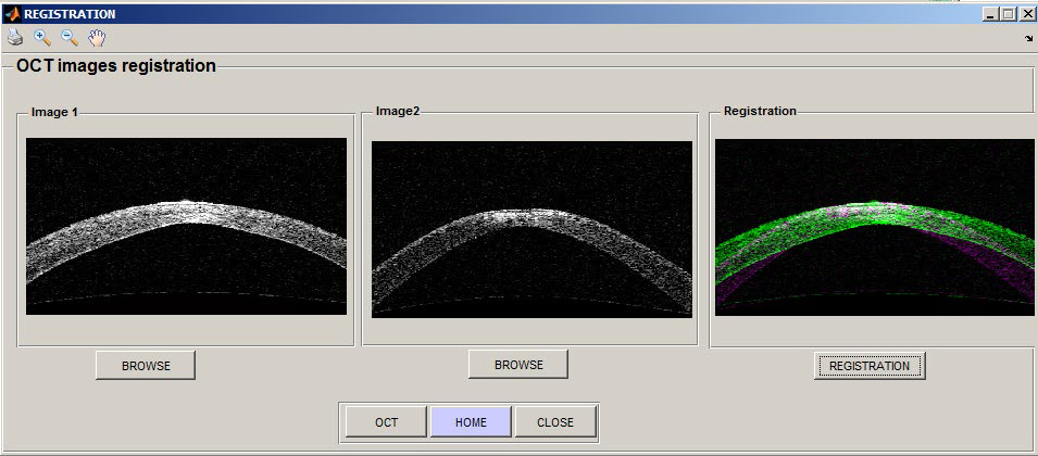 The shown registration window in Figure 4 gives an option to open and display the two images for comparison. With the "REGISTRATION" button, the ophthalmologists can view the results of the registration.