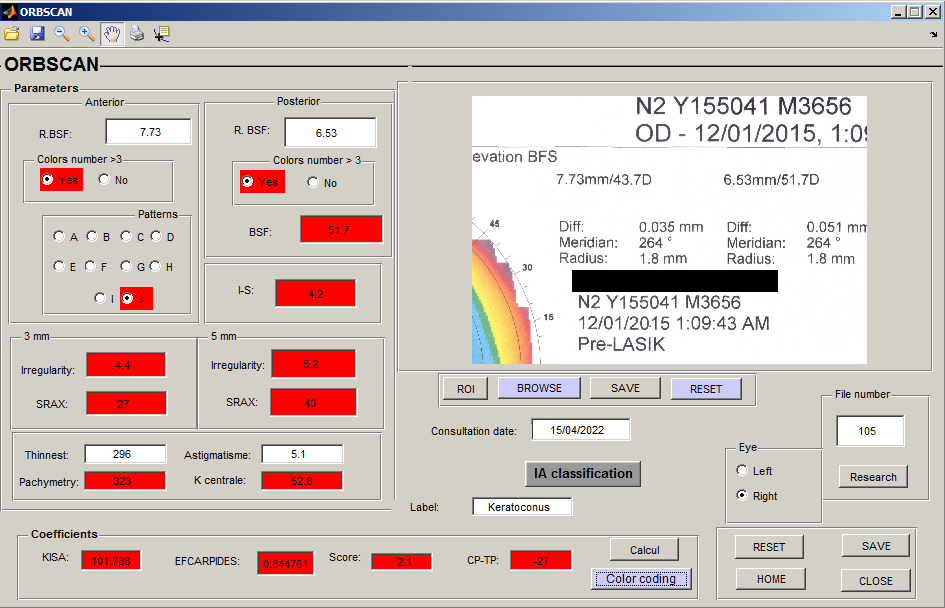 Indeed, this achieved application creates a practical environment for the ophthalmologists to process, store medical data, and to participate in the decision-making on the severity of keratoconus. It also ensures the creation of large databases, allowing the real effective medical studies, which influence an early detection of this disease.