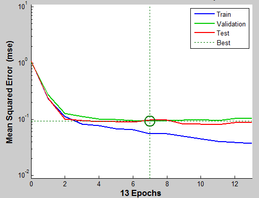 Figure 6 below represents the evolution of the mean square error during the training, validation and testing in relation to the number of Epochs.