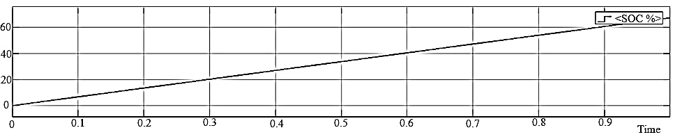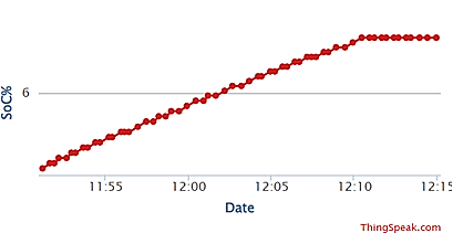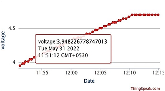The voltage profile obtained in Thingspeak after the online condition monitoring of supercapacitors incorporated using the Internet of Things, the data transferred from MATLAB-Simulink is done using the MQTT protocol is shown in Figure 8. MQTT is one of the standard protocols for the Internet of Things. The data transferred is secured by an API key and can only be accessed through a password enhancing the safety of the system. Figure 9 and Figure 10 show the % SoC results in MATLAB/Simulink and ThingSpeak, respectively. Results prove that the voltage and SoC of the system is monitored successfully.