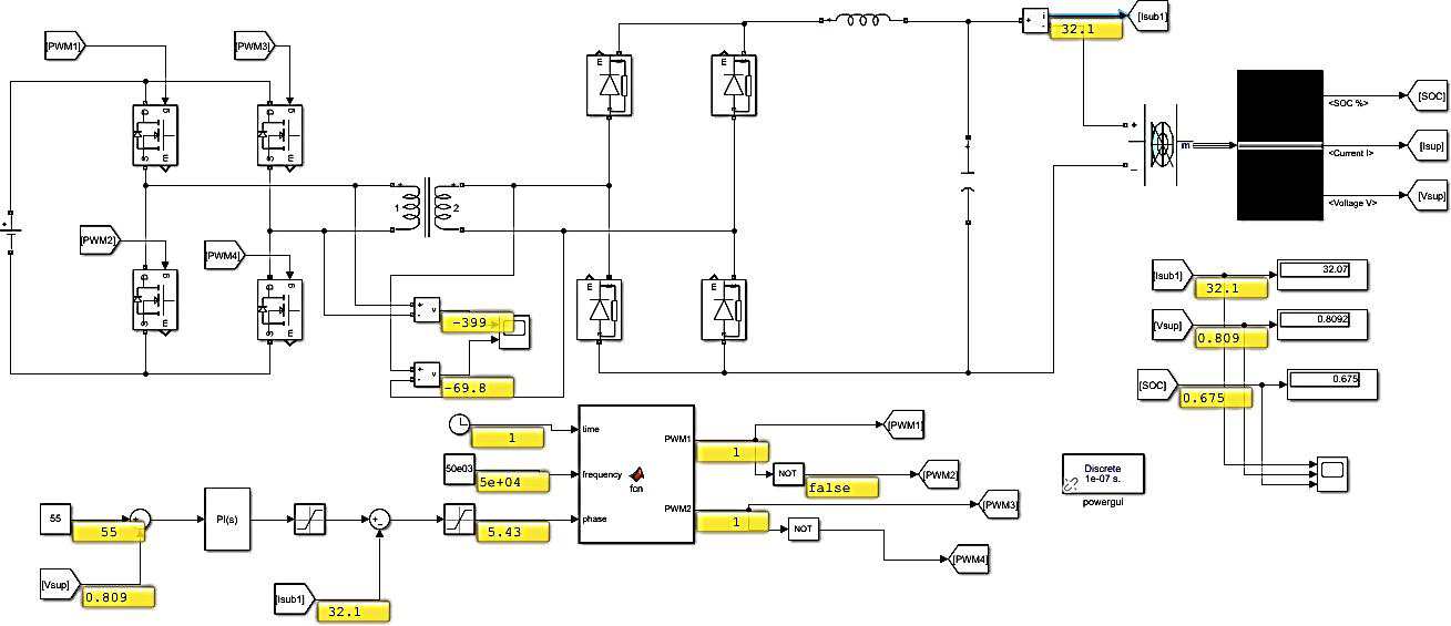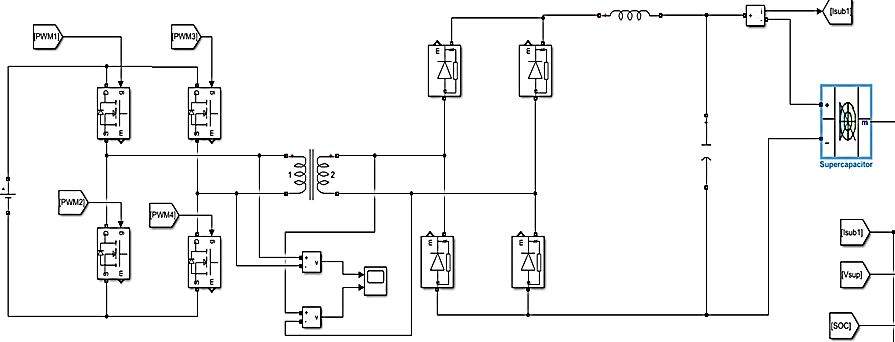 Condition monitoring is vital to ensure the smooth working of the supercapacitor (Yang et al., 2016). The IoT-based condition monitoring system will allow the engineering team to wirelessly monitor supercapacitor conditions in each vehicle connected to the system. The Internet of Things is a synthesis of hardware and software. More precisely, it is divided into four parts that are IoT hardware, IoT platforms, deep dive programming and case study - deployment scenarios. Figure 1 illustrates schematic of phase shift full bridge DC-DC converter, DC voltage is applied to the MOSFET junction. Since the circuit incorporates a transformer, the voltage transmission and insulation from the line voltage are incorporated into the phase-shifted full-bridge (PSFB) stage. The switches within the PSFB converter can operate at zero voltage by utilizing the energy stored in the transformer's leakage inductance to charge or discharge the switches' output capacitance during the dead-time interval. The PSFB method utilizes the energy contained in the leakage inductance of the power transformer to gradually switch on each of the four power MOSFETs in the full bridge, in contrast to the abrupt switching of a regular full bridge. This results in zero voltage switching (ZVS) when the drain-to-source voltages of the external power MOSFETs reach or approach zero volts. This eliminates the instantaneous turn-on power loss of the MOSFETs caused by drain-to-source capacitance and parasitic capacitance discharge, leading to increased efficiency, reduced switching-related electromagnetic interference (EMI), and the elimination of the need for primary-side snubbers. Now, shifting focus to the first aspect of the research, IoT hardware is employed using a cloud-based implementation utilizing ThingSpeak, as well as online MATLAB and offline MATLAB Simulink. The supercapacitor is charged using a phase-shifted full bridge DC-DC converter. The simulation diagram of the circuit is shown in Figure 2.