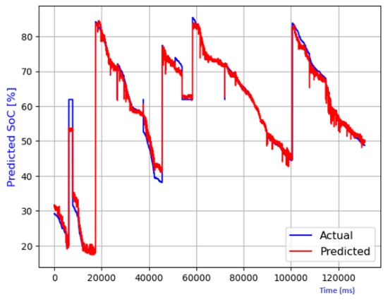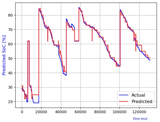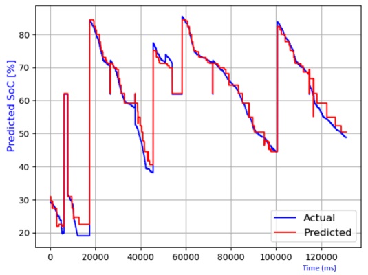 Figure 7 through Figure 12 exhibit a comparison between the predicted and actual state of charge (SoC) percentages using distinct models, namely linear regression, decision tree, random forest, elastic net, lasso regression, and ridge regression. Correspondingly, Table 1 shows the performance metrics considering R2 score, mean absolute error (MAE), mean squared error (MSE), and root mean squared error (RMSE). It can be observed that the SoC estimation models were able to estimate the values correctly. The advantage of lasso regression is that it can help to reduce dimensionality within a dataset by shrinking the weight parameters to zero, eliminating less important features from the model. The lasso regression model stands out for its superior predictive capabilities. This is substantiated by its highest R2 score, signifying its ability to account for 99.4% of the data's variability. Moreover, it records the lowest MAE, MSE, and RMSE values, attesting to its remarkable accuracy. Notably, the lasso regression model leverages L1 regularization, which curtails the influence of less significant features and mitigates overfitting issues. The ridge regression model also performed well in the SoC estimation. The advantage of this model is that the datasets that have many correlated features can be modeled accurately.