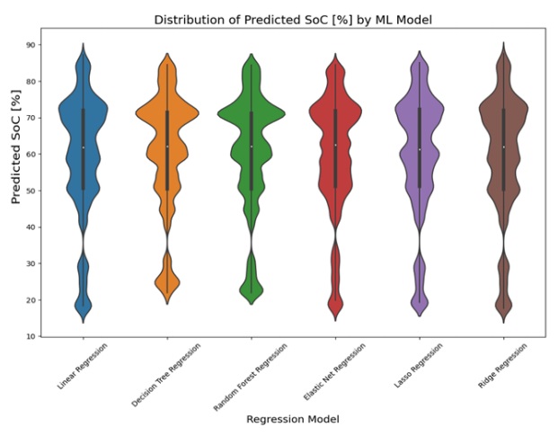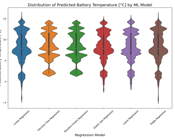 The violin plot displayed the predicted values for each AI model. The plot for predicting state of charge (SoC) was shown in Figure 19, while the plot for estimating battery temperature was shown in Figure 20. The lasso regression model had the narrowest part in the violin plot, indicating the least variability in predicted values, which was consistent with its low values for MAE, MSE, and RMSE in the results table. On the other hand, the random forest regression and decision tree regression models had wider parts in their violin plots, suggesting more variability in predicted values. However, they still had relatively high probability densities near their median predicted values, indicating good predictive performance.