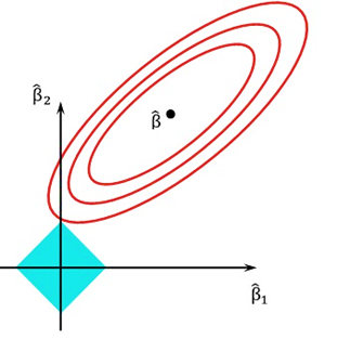 Lasso regression, also known as L1 regularization, is a type of linear regression model that helps to estimate the relationship between a dependent variable and a set of independent variables. The goal of lasso regression is to select a subset of independent variables that are most important in predicting the dependent variable, while shrinking the coefficients of the remaining variables to zero. The lasso regression model adds a penalty term to the standard linear regression equation, which penalizes the sum of the absolute values of the coefficients of the independent variables. This penalty term encourages the model to eliminate the coefficients of irrelevant variables and reduces the influence of noisy or redundant variables. Lasso regression selects only a subset of variables and avoids overfitting, leading to improved prediction accuracy and interpretability. The contours of error and constraint functions are shown in Figure 6.